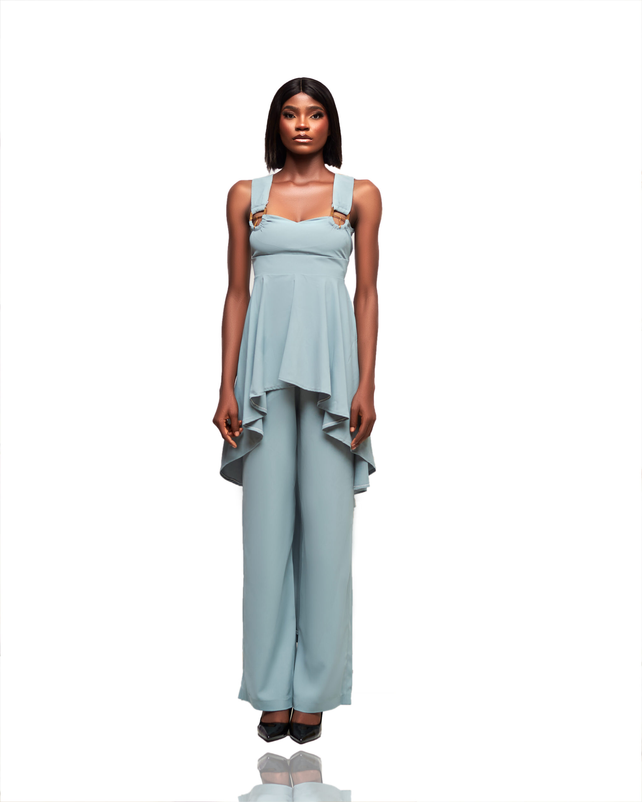 Crafted in a soft, muted blue tone, this one-piece ensemble features wide shoulder straps accentuated with statement metallic ring detailing for a bold yet polished finish.