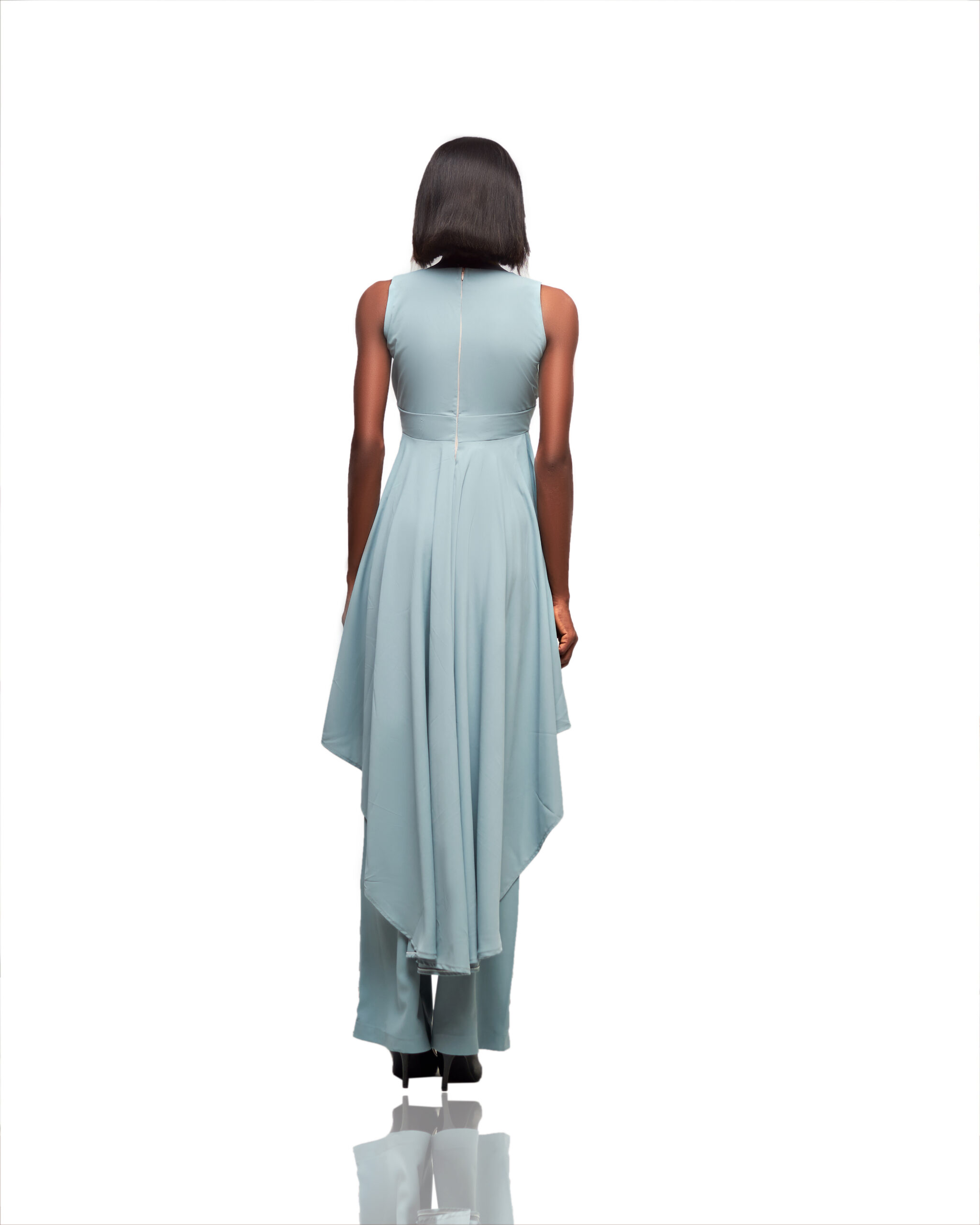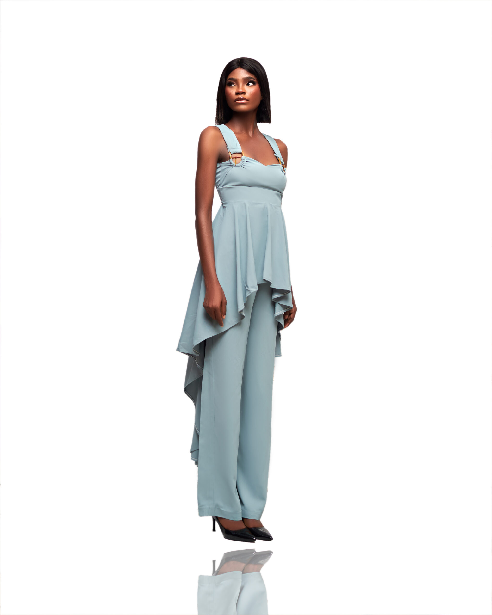 The sweetheart neckline adds a touch of femininity, while the dramatic high-low peplum overlay gracefully cascades down the sides, creating a flattering silhouette that elongates the body. The wide-leg trousers offer comfort and fluid movement, making this jumpsuit ideal for both formal events and elevated daywear.