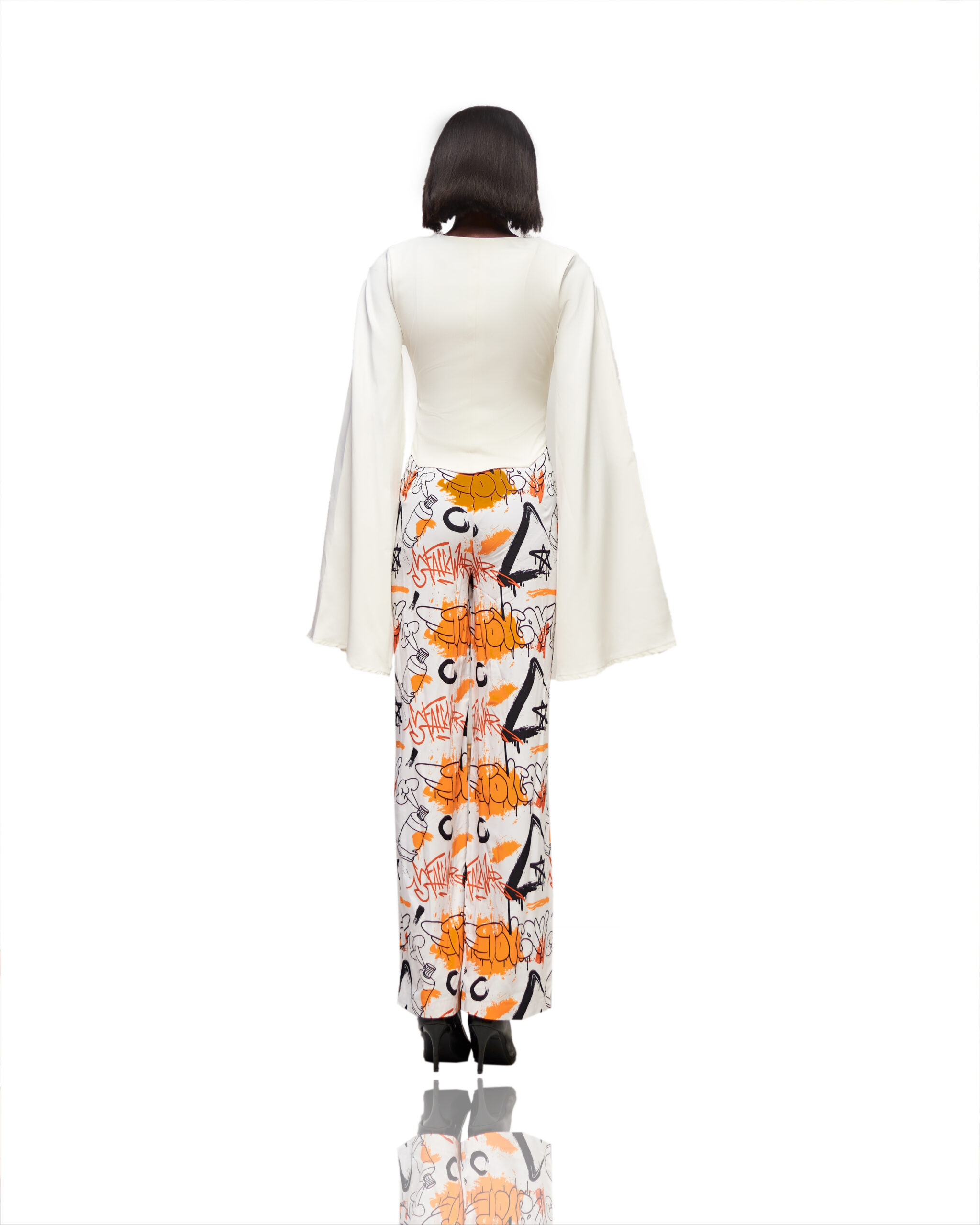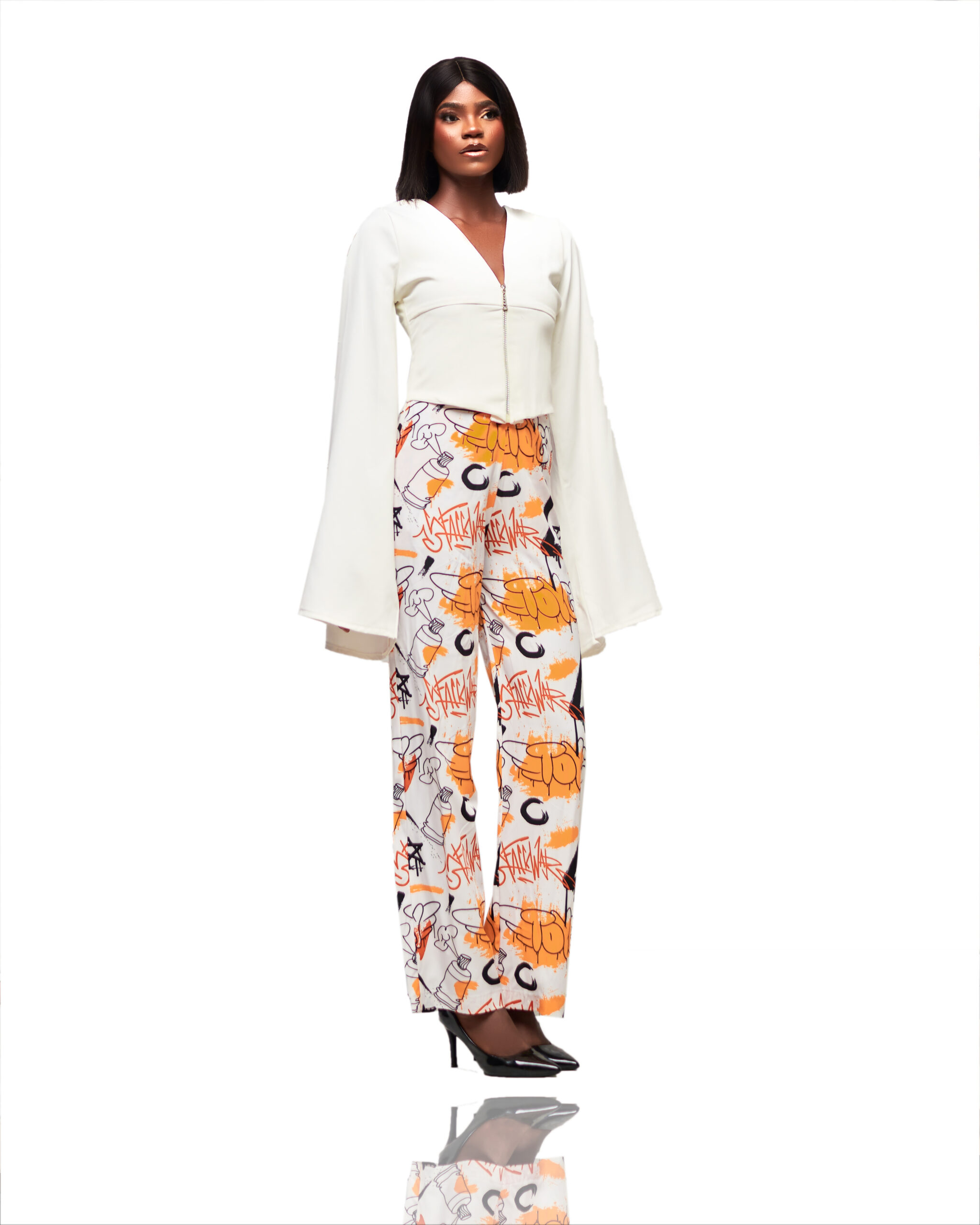 The matching high-waisted palazzo pants boast a vibrant graffiti-inspired print in shades of orange, black, and white. The wide-leg cut adds fluid movement and comfort, while the street-art motifs give off a youthful, expressive vibe that commands attention. Whether styled for a creative work environment, a gallery outing, or an upscale casual event, this set delivers standout style with ease.